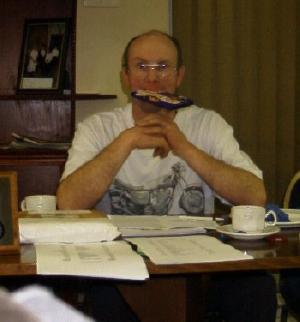 The 2001 AGM was a 4 hour marathon however Archivist, John Faulkner had come prepared. Here he is munching through yet another chocolate bar.